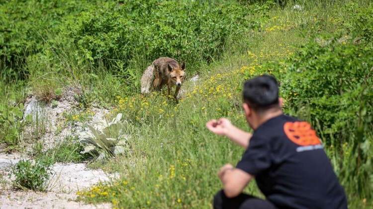 İnsanlardan kaçmayan ve yaklaşan tilki, verdikleri yiyeceklerle karnını doyuruyor.