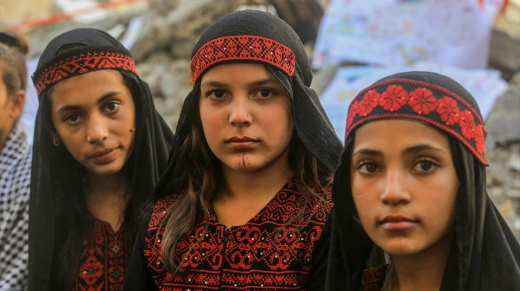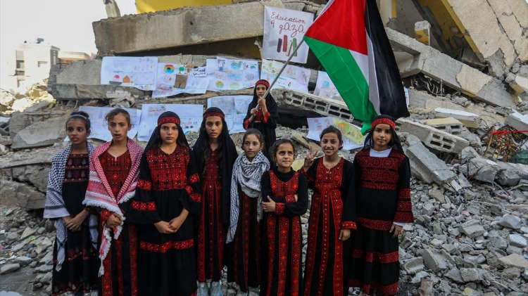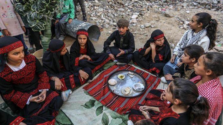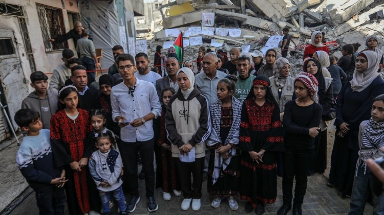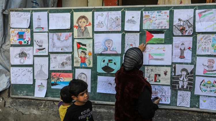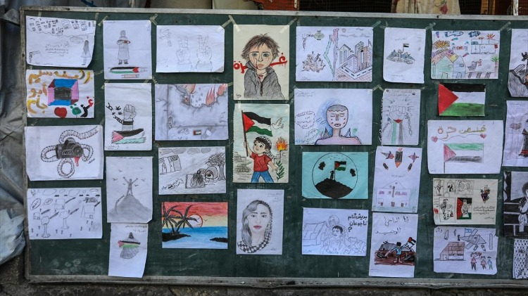 Gazze Şeridi’nin güneyindeki Han Yunus kentinde, İsrail ordusunun yıkıma uğrattığı evlerin enkazı arasında çocukların savaş sırasında yaşadıkları psikolojik durumu ve Filistin kültürel mirasını yansıtan resimlerinin yer aldığı bir etkinlik düzenledi.