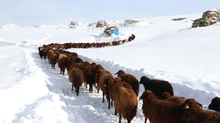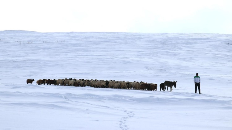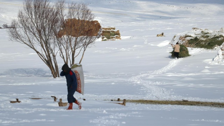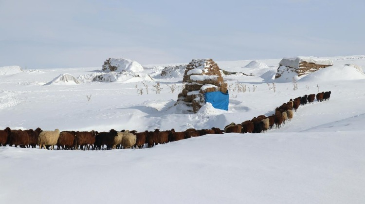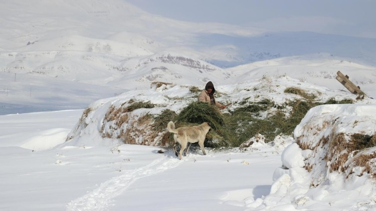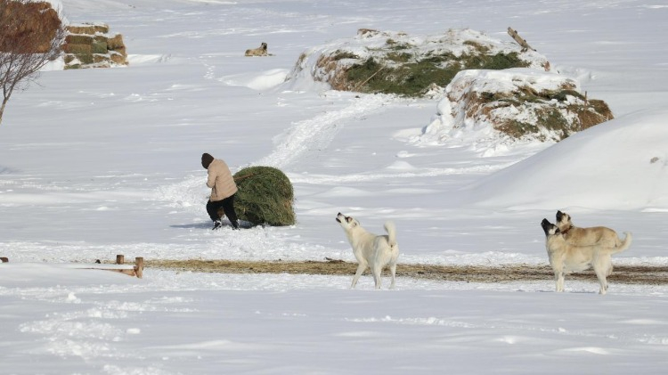 Geceleri hava sıcaklığının sıfırın altında 20 derecelere düştüğü bölgede besiciler, 1 metreyi bulan karda hayvanlarının ot, saman ve su ihtiyacını günlük karşılıyor.