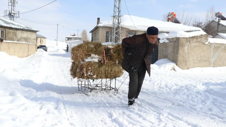 Besicilerin bir kısmı ezdikleri karın üzerinde bir kısmı da zorlu hava koşulları nedeniyle kızaklarla evlerinin bahçesine taşıdıkları otlarla hayvanlarını besliyor.