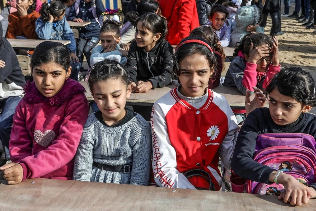 İsrail'in abluka altındaki Gazze Şeridi'ne yönelik saldırıları aralıksız devam ederken yerinden edilen Filistinlilerin Kaldığı Han Yunus kentine bağlı Mavasi bölgesinde çocukların eğitime devam edebilmesi için kurulan prefabrik okulun açılışı gerçekleşti.