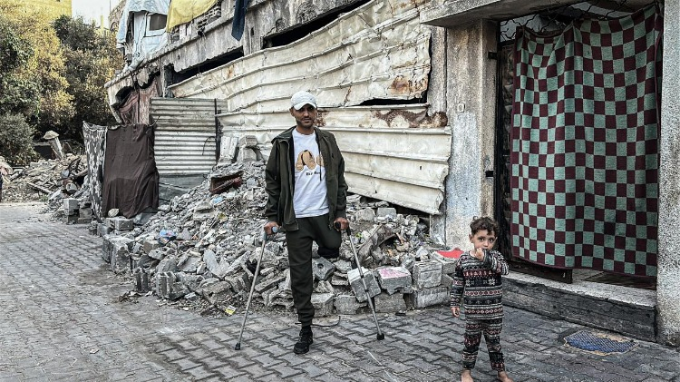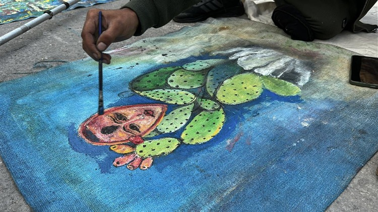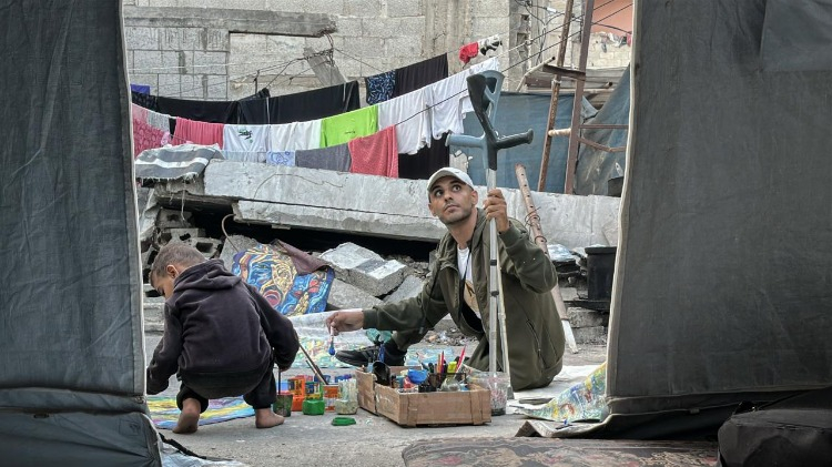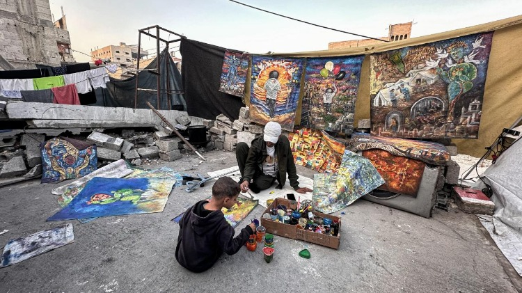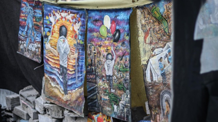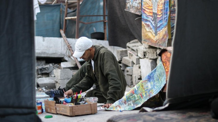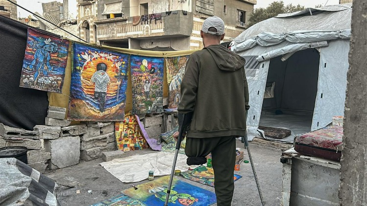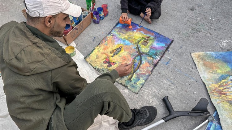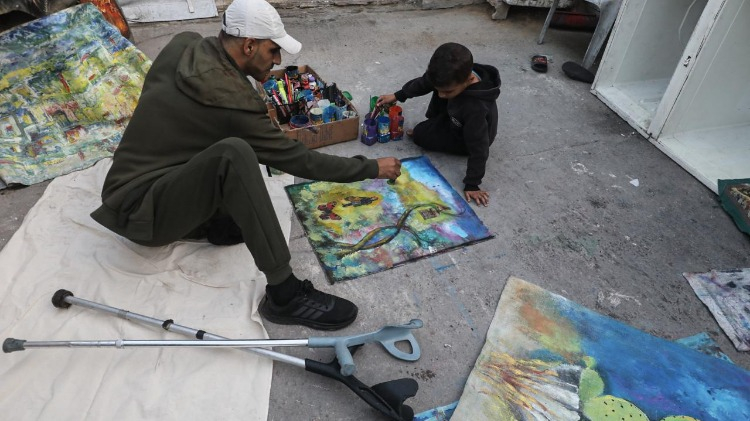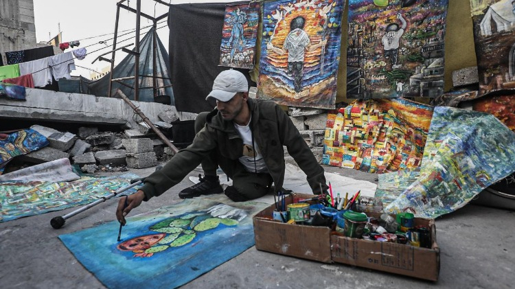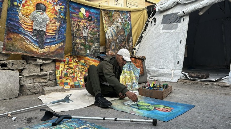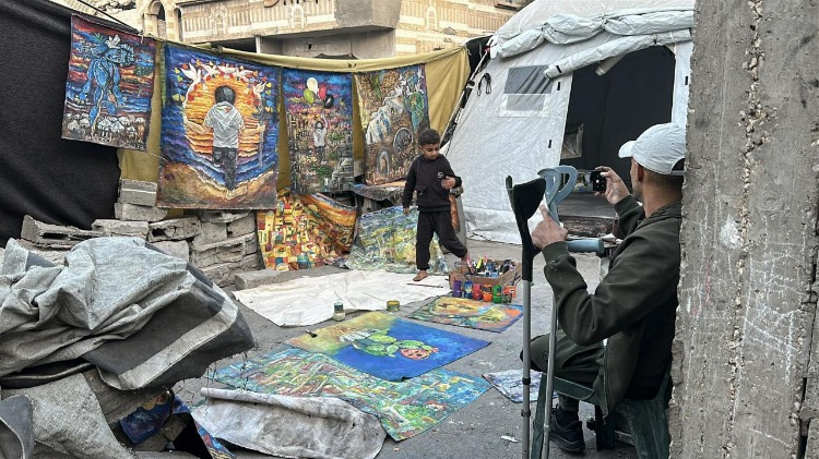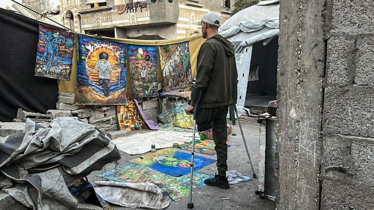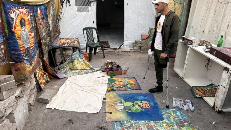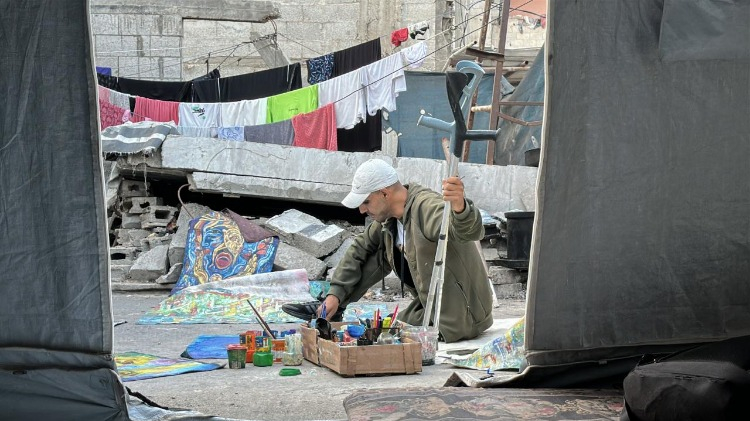 Gazze Şeridi’nin orta kesimindeki Bureyc Mülteci Kampı’nda yaşayan 33 yaşındaki Filistinli sanatçı Cihad Raed el-Ghul, İsrail saldırısında bir bacağını kaybetmesine ve atölyesinin yıkılmasına rağmen resim yapmayı sürdürüyor.
