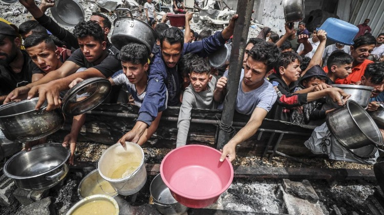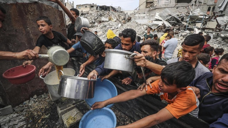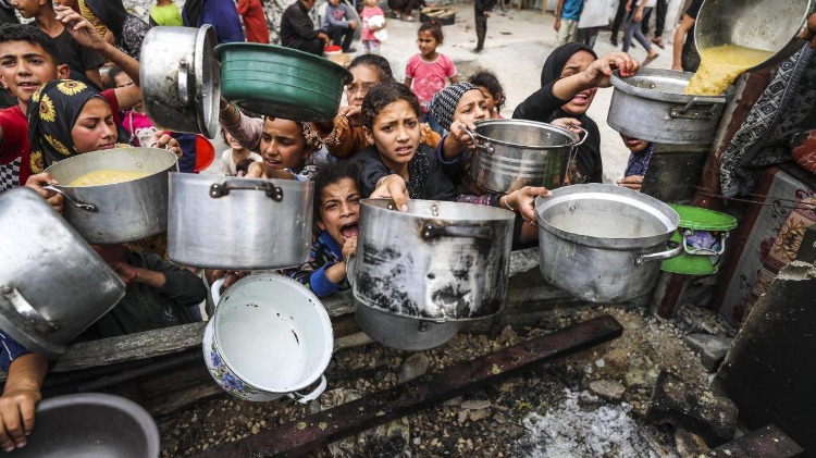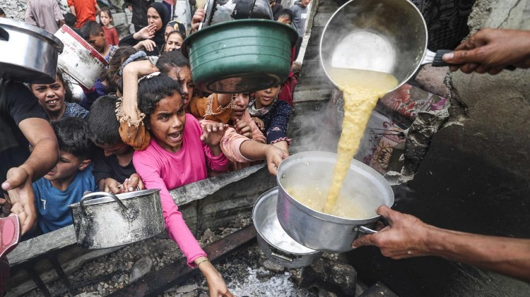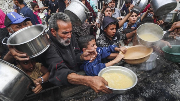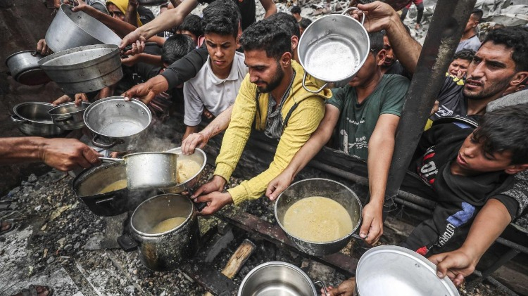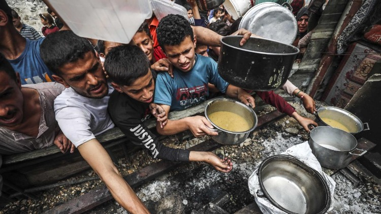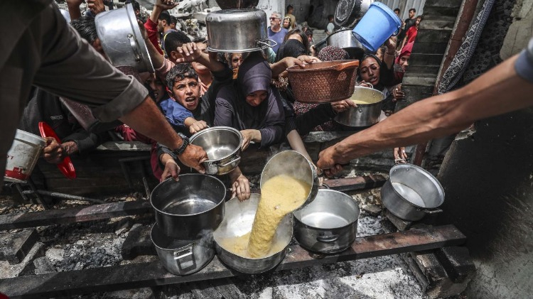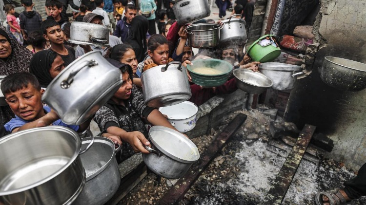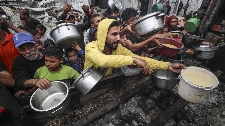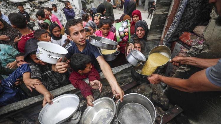 İsrail'in abluka altındaki Gazze Şeridi'ne yönelik acımasız ve yıkıcı saldırıları aralıksız sürerken, uygulanan tam ambargo nedeniyle bölgede derinleşen "insani kriz" devam ediyor. Gazze Şeridi'nin kuzeyindeki Cibaliye Mülteci Kampı'nda, yerinden edilen Filistinlilere hayır kurumları tarafından yemek dağıtımı yapıldı. Yemek alabilmek için aralarında çocukların da bulunduğu çok sayıda Filistinli, izdiham oluşturdu.