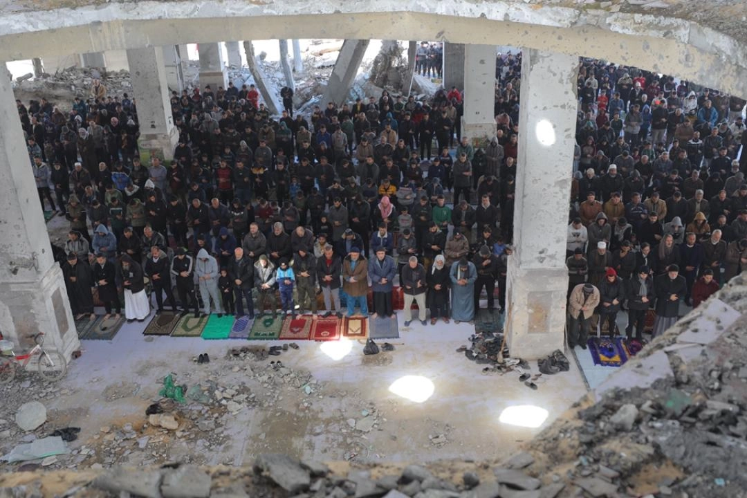 İsrail saldırılarında ağır hasar alan Gazze kentinin Zeytun Mahallesi'ndeki El Şafii Camii'nde toplanan Filistinliler, moloz ve yıkıntıların arasında cuma namazı kıldı.