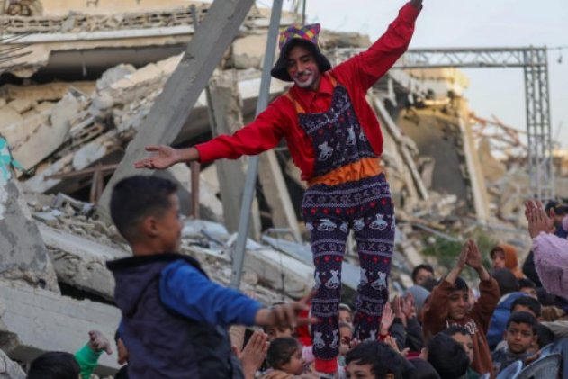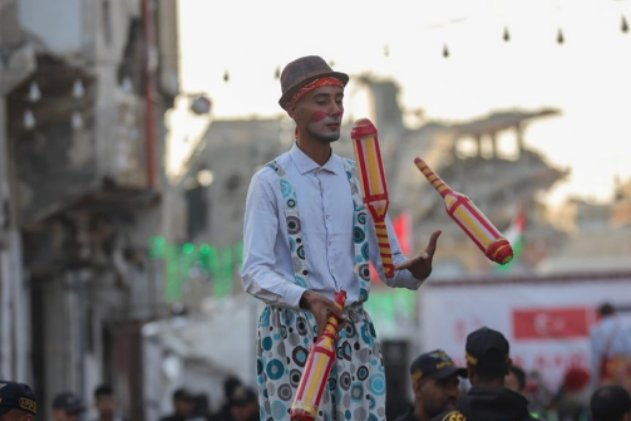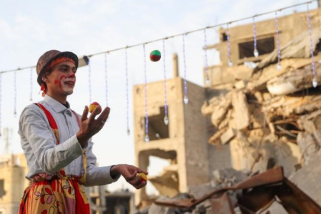 Etkinlik enkaz arasında gerçekleştirilirken, palyaço kostümü giyen gençler çocukları eğlendirdi.