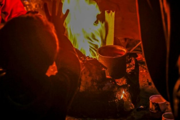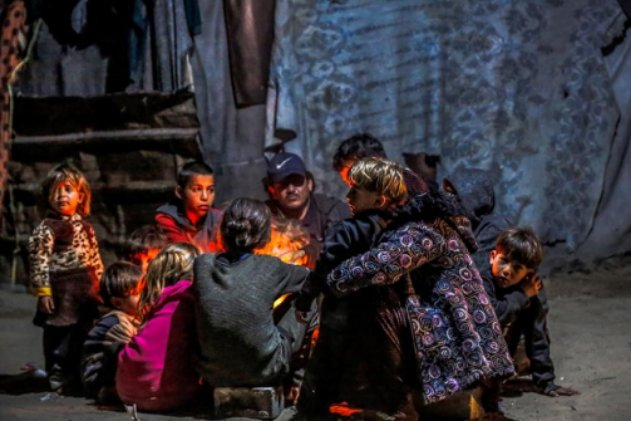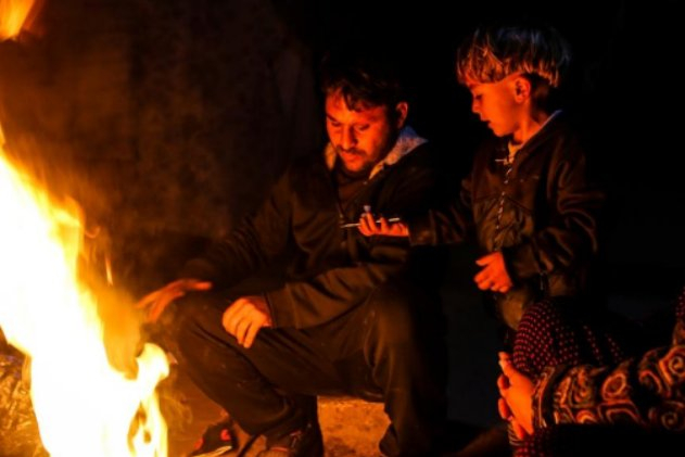 Mahalle sakinlerinden Subuh ailesi, iftar sonrası ateş yakarak ısınmaya çalıştı.
