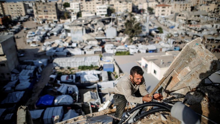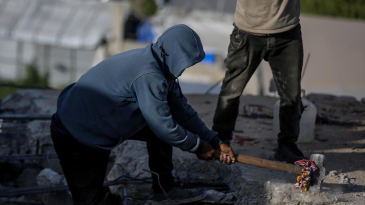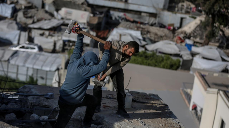 Ağır iş makinesi ve temel ekipman yetersizliğinin yaşandığı Gazze kent merkezinde Filistinliler, basit el aletleriyle temizlik ve enkaz kaldırma çalışması yürüttü.