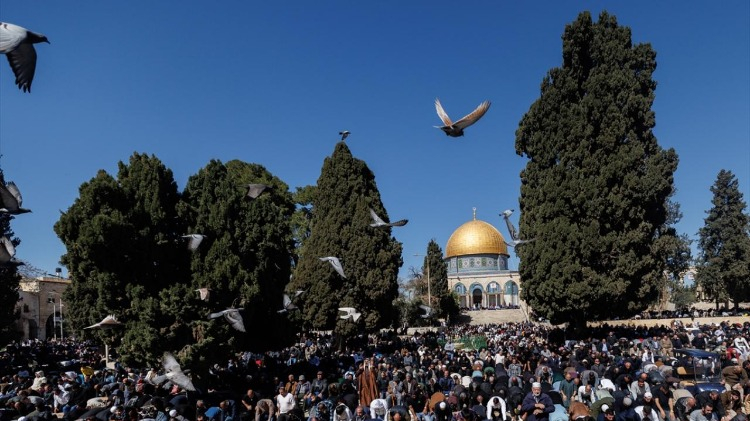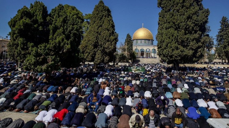 İsrail işgali altındaki Doğu Kudüs bulunan Mescid-i Aksa’ya akın eden on binlerce Filistinli, cuma namazını Müslümanların ilk kıblesinde eda etti.