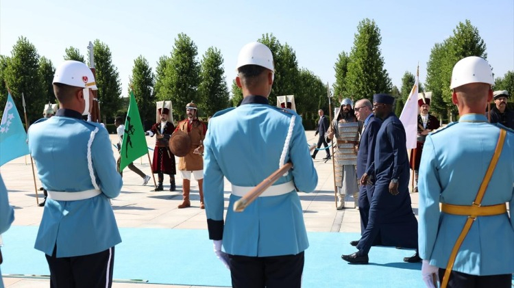 Erdoğan ve Sonko`nun tören alanındaki yerlerini almasının ardından, bando iki ülkenin milli marşlarını çaldı.