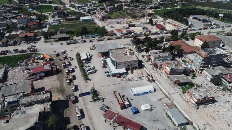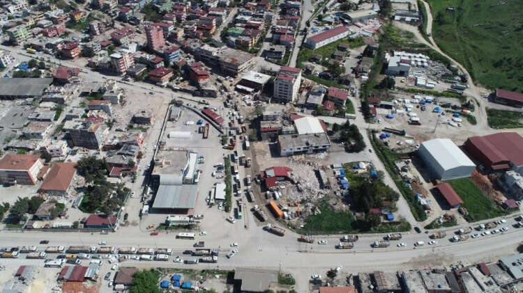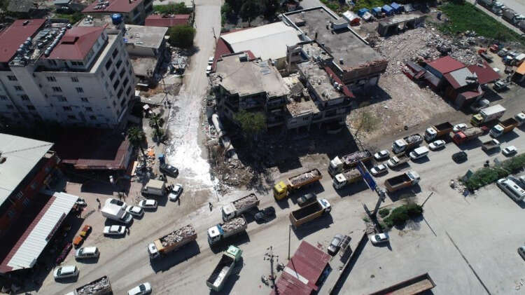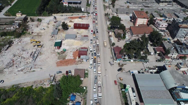 Hatay'da depremin ardından enkaz kaldırma çalışmaları devam ediyor. Kamyonların oluşturduğu kuyruk ve vadiye dökülen molozlardan oluşan dağ havadan görüntülendi.