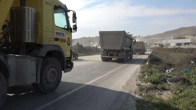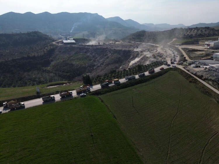 Hatay’da depremlerin ardından yıkılan binaların enkazını taşıyan onlarca hafriyat kamyonu, yüzlerce metre kuyruk oluşturdu. Kamyonlar harıl harıl çalışıyor...