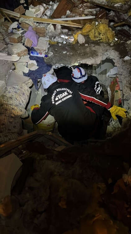 Yürütülen arama kurtarma çalışmalarında ilk olarak Şahin Ulutaş isimli kazazedeyi enkazdan sağ çıkartarak sağlık ekiplerine teslim eden Edremit ekibi, yürüttüğü çalışmalar sonucunda aynı enkazda Yasemin Karakurt isimli depremzedeyi de sağ çıkarttı.