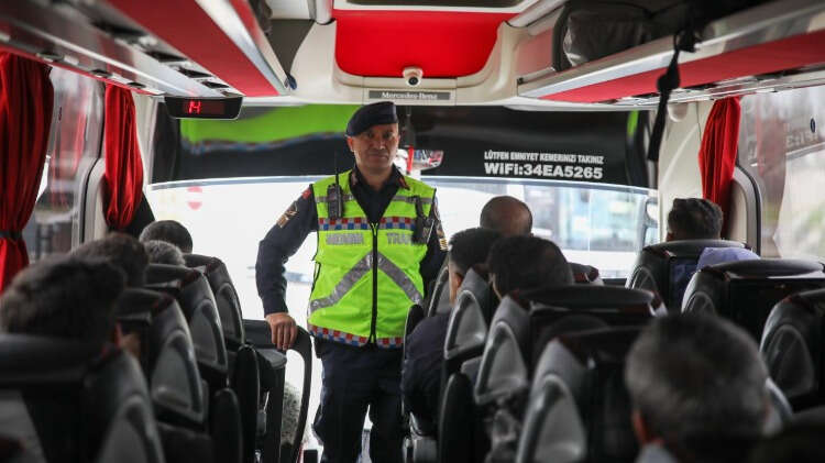 Otobüs terminallerinde yolcu taşımacılığı yapan araçları denetleyen ekipler, alkol ve uyuşturucu testi yaptıkları sürücülerin takograf cihazları ile yetki belgelerini kontrol ediyor.