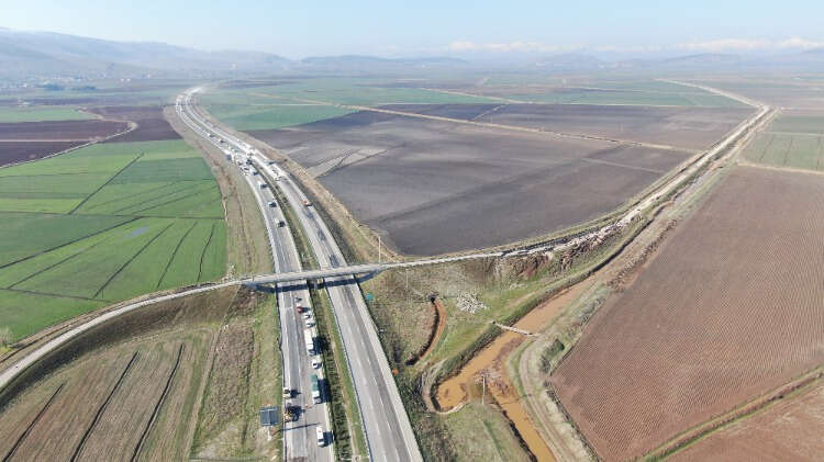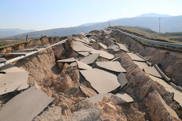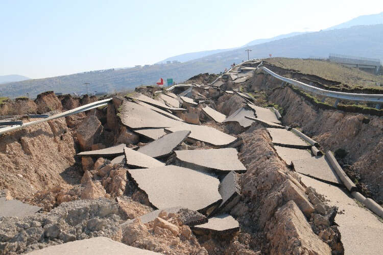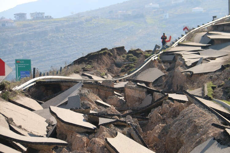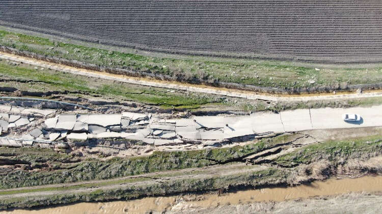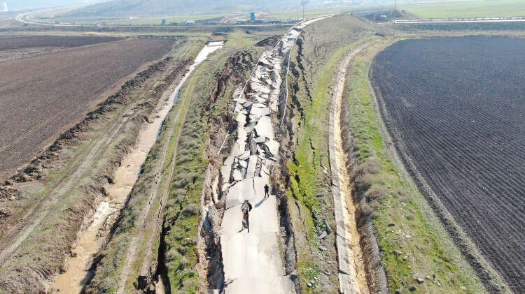 Kahramanmaraş'ta depremin büyüklüğünü gözler önüne seren otobanın üzerinden geçen bağlantı yolu çevresinde oluşan devasa çatlak, havadan görüntülendi.
