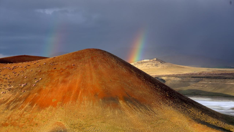 Konya’nın Karapınar ilçesinde bulunan ve ‘dünyanın nazar boncuğu’ olarak bilinen Meke Krater Gölü, baharın gelmesiyle birlikte çiçek açan ağaçlar ve gökkuşağı eşliğinde güzel görüntüler oluşturdu.