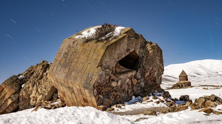 UNESCO Dünya Miras Listesi'nde yer alan Kars'taki Ani Ören Yeri, son günlerde etkili olan kar yağışıyla beyaza büründü. Karla kaplanan Ani'deki Ebul Menucehr Camisi, yıldız pozlama tekniğiyle görüntülendi.