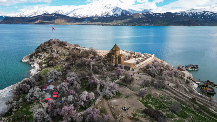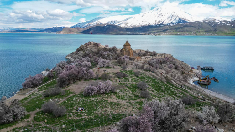 Van'da en çok ziyaret edilen yerlerin başında gelen Van Gölü'ndeki Akdamar Adası, badem ağaçlarının çiçek açmasıyla baharın renklerine büründü.