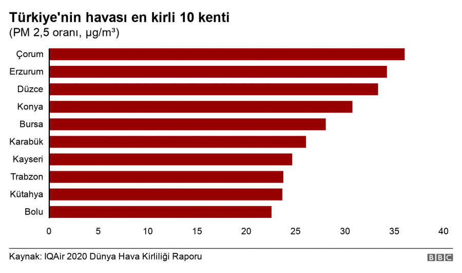 Türkiye, 106 ülkeyi kapsayan 2020 Dünya Hava Kirliliği Raporu'nda üç sıra gerileyerek 46'ncı sırada yer aldı. Rapora göre Türkiye'de hava kirliliğinin en yoğun olduğu kentler Çorum, Erzurum ve Düzce.