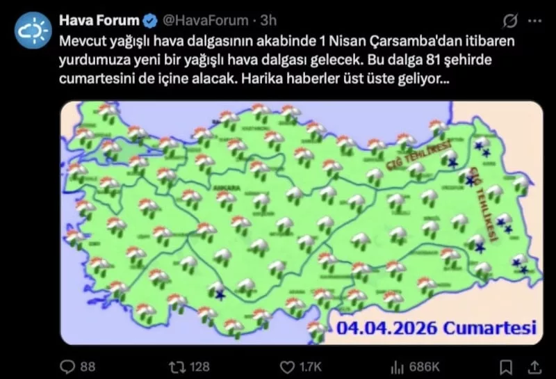 Yağışların hafta sonuna kadar süreceğini belirten Hava Forum, "Mevcut yağışlı hava dalgasının akabinde 1 Nisan Çarsamba'dan itibaren yurdumuza yeni bir yağışlı hava dalgası gelecek. Bu dalga 81 şehirde cumartesini de içine alacak." uyarısında bulundu.