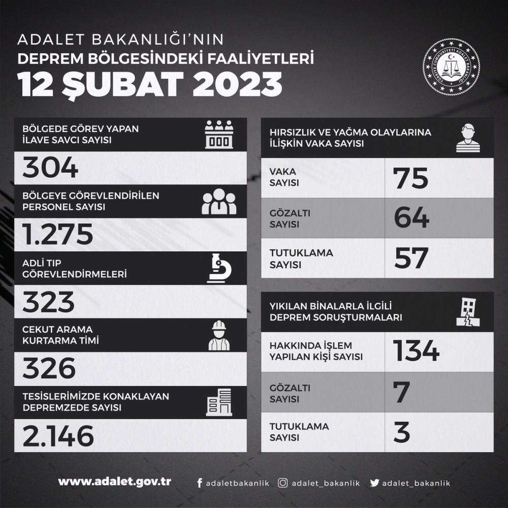 Adalet Bakanlığı sosyal medya hesabından yaptığı açıklamada, bölgede 304 ilave savcının görevlendirildiğini açıkladı. Bölgeye görevlendirilen ilave personel sayısının bin 275 olarak açıklandığı paylaşımda, adli tıp görevlendirilmeleri için 323, CEKUT Arama Kurtarma timi personel sayısı 326, Adalet Bakanlığı tesislerinde konaklayan depremzede sayısı ise 2 bin 146 olarak açıklandı.