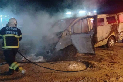 Çorum’da seyir halindeyken alevlere teslim olan hafif ticari araç kullanılmaz hale geldi. Yangın itfaiye ekiplerinin müdahalesi ile söndürüldü.