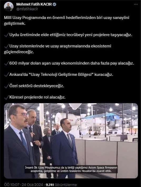 Sanayi ve Teknoloji Bakanı Mehmet Fatih Kacır, sosyal medya hesabından yaptığı açıklamada, "Milli Uzay Programında en önemli hedeflerimizden biri uzay sanayiini geliştirmek. Uydu üretiminde elde ettiğimiz tecrübeyi yeni projelere taşıyacağız. Uzay sistemlerinde ve uzay araştırmalarında ekosistemi güçlendireceğiz. 600 milyar doları aşan uzay ekonomisinden daha fazla pay alacağız. Ankara'da 'Uzay Teknoloji Geliştirme Bölgesi' kuracağız. Özel sektörü destekleyeceğiz. Küresel projelerde rol alacağız" dedi..