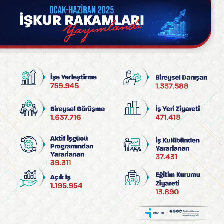 Bakan Işıkhan sosyal medya hesabından yaptığı paylaşımda, İŞKUR sayesinde başta kadınlar, gençler, engelliler gibi dezavantajlı gruplar olmak üzere, insanları işgücü piyasasına kazandırmaya yönelik politikaları başarıyla sürdürdüklerini belirterek, "Ocak-Haziran aylarında toplam 759 bin 945 işe yerleştirmeye aracılık ettik. 1,6 milyondan fazla bireysel görüşme ve 471 bin 418 iş yeri ziyareti gerçekleştirdik. 1,2 milyona yakın açık iş (işveren tarafından talep edilen-ihtiyaç duyulan eleman) tespit ettik. İşgücü piyasasının dinamiklerine ve tespit ettiğimiz ihtiyaçlara yönelik adımlarımız ile ülkemizin ekonomik kalkınmasına destek olmaya devam edeceğiz" ifadelerine yer verdi.