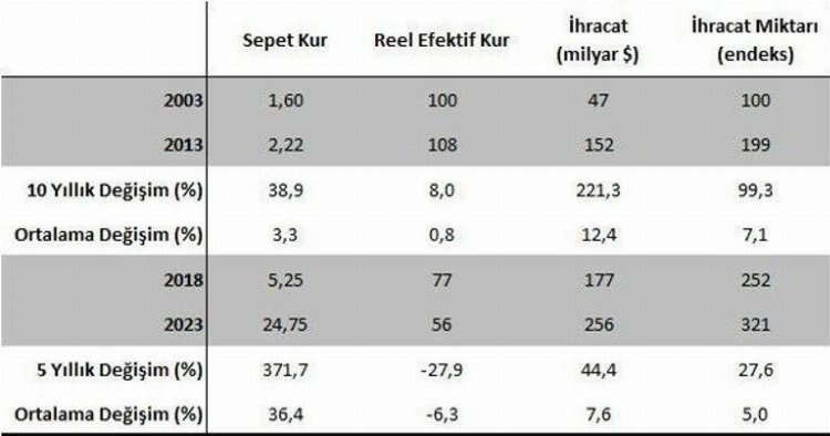 2003-13 döneminde nominal sepet kur yıllık ortalama yüzde 3,3; reel ihracatımız yüzde 7,1 artmıştır. 2018-23 döneminde ise kur yüzde 36,4 artarken, ihracatımız sadece yüzde 5 artmıştır.