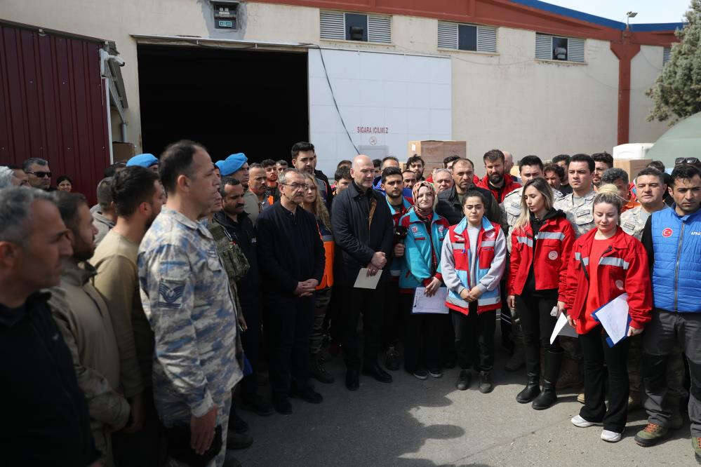 Şehirdeki bütün yardımların geldiği toplandığı dağıtıldığı lojistik depo da olduklarını belirten İçişleri Bakanı Süleyman Soylu:" Burada 400’e yakın arkadaşımız çalışıyor. Herkes seferber. Öncelikle bu çalışmayı yapan bütün arkadaşlarımıza teşekkür ediyoruz. Allah razı olsun. Aynı zaman da ihtiyaçlar durmuyor. Özellikle geçici yaşam merkezlerine geçince elbette ki buradan istiflenen yardımlar depremzede vatandaşlarımıza ulaştırılıyor. Ancak ihtiyaçlar var. Aynı zaman da deprem bölgelerine dönüşler başladı. Biz bunu hissediyoruz. Gerek çadır talepleri ve günlük verdiğimiz yemekler sürekli artıyor" diye konuştu.