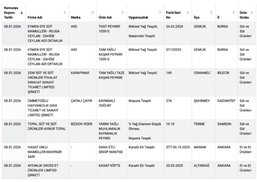 Güncellenen listede, günlük tüketimde sıkça yer alan bazı ürün gruplarında mevzuata aykırı uygulamaların tespit edildiği belirtildi.