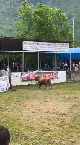 Artvin’in Murgul ilçesinde düzenlenen boğa güreşlerinde rakibini bekleyen boğa protokol tribününe daldı. Boğa tribünü birbirine katarken o anlar saniye saniye yansıdı.