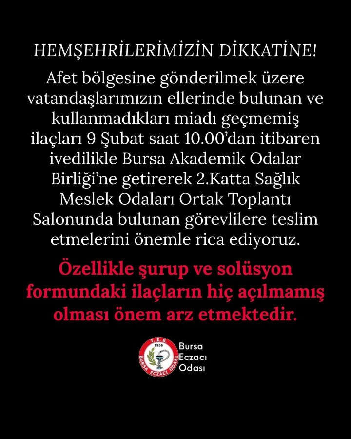 Afet bölgesine gönderilmek üzere vatandaşlarımızın ellerinde bulunan ve kullanmadıkları miadı geçmemiş ilaçları 9 Şubat saat 10.00'dan itibaren ivedilikle Bursa Akademik Odalar Birliği'ne getirerek 2.Katta Sağlık Meslek Odaları Ortak Toplantı Salonunda bulunan görevlilere teslim etmelerini önemle rica ediyoruz.