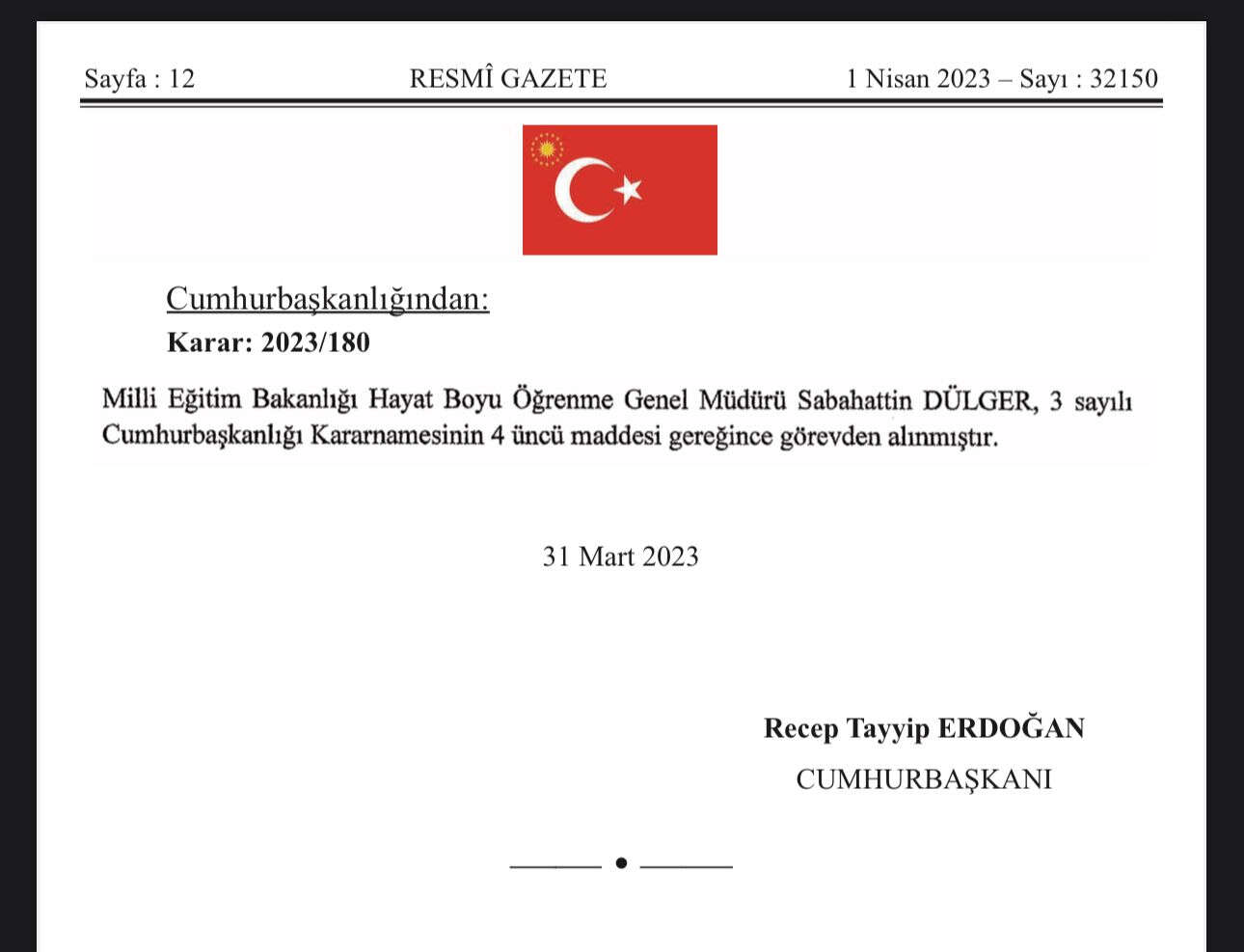 1 Nisan 2023 Cumartesi tarihli atama/görevden alma kararnamesi Resmi Gazete'de yayımlandı. Bursa Milli Eğitim Bakanlığı Hayat Boyu Öğrenme Genel Müdürü Sabahattin Dülger görevden alındı.