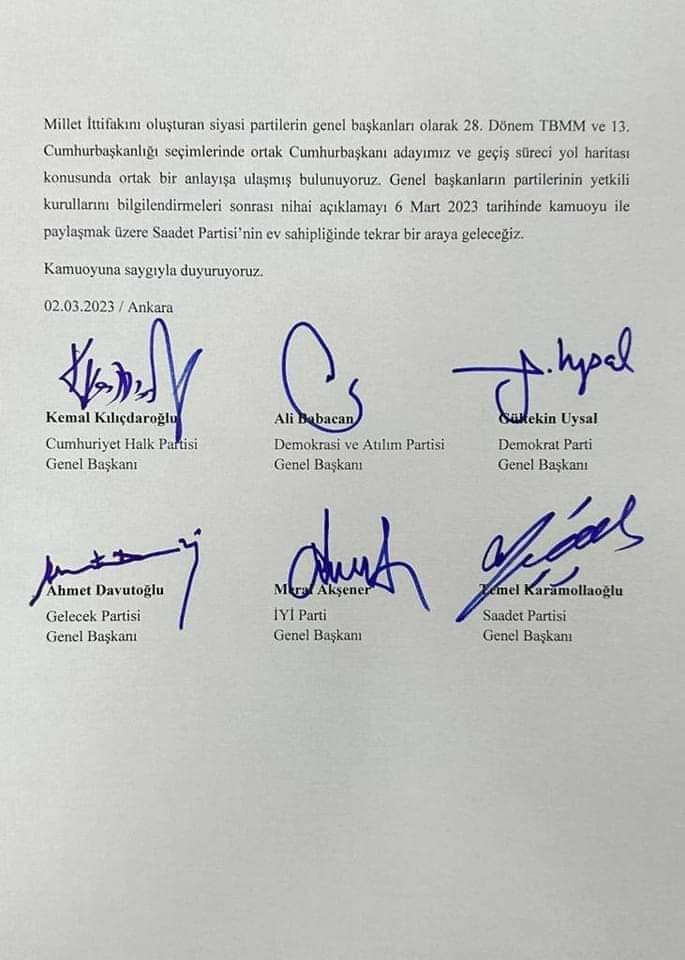 Son olarak 18 Şubat'ta "Deprem Özel Gündemi"yle toplanan altılı masa liderleri, toplantı sonrası yaptıkları açıklamada, "Millet İttifakı olarak önceden planladığımız ve yaşanan deprem sonrası tehir ettiğimiz rutin toplantımızı ise Saadet Partisi’nin ev sahipliğinde, 2 Mart Perşembe günü gerçekleştireceğimizi kamuoyunun bilgisine sunarız" demişti.