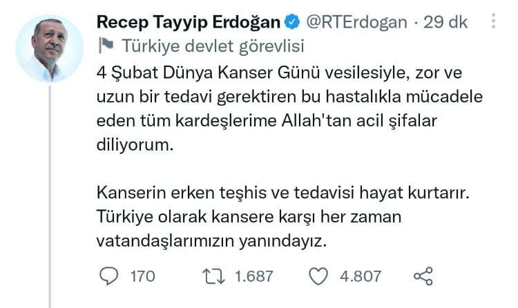 "4 Şubat Dünya Kanser Günü vesilesiyle, zor ve uzun bir tedavi gerektiren bu hastalıkla mücadele eden tüm kardeşlerime Allah'tan acil şifalar diliyorum. Kanserin erken teşhis ve tedavisi hayat kurtarır. Türkiye olarak kansere karşı her zaman vatandaşlarımızın yanındayız.