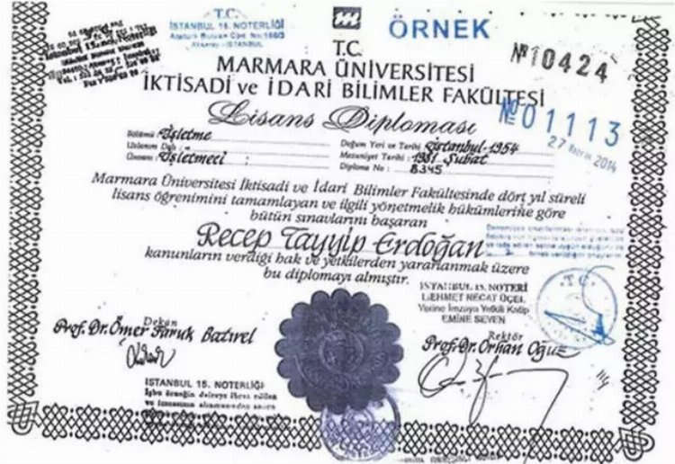 Altun’un açıkladığı belgelere göre Erdoğan’a bu okuldan verilen 678 no’lu ve 3 Nisan 1981 tarihli geçici mezuniyet Belgesi Dekan Doç. Dr. Sinan Artan imzasını taşıyor. Aynı belgenin 677 sayılı olanında ise Recep Tayyip Erdoğan imzası ve el yazısıyla, ‘geçici mezuniyet belgemin aslını elden aldım’ ifadesinin yer aldığı görülüyor.