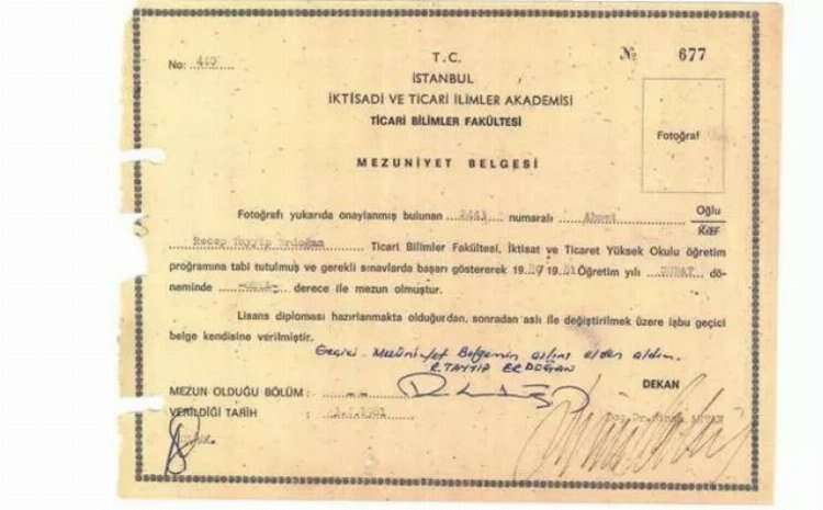 Üniversite sınavına girdiği yıl olan 1974’e ait Üniversitelerarası Seçme Sınavı Sonuç Belgesi’nde ise Erdoğan’ın İstanbul İktisadi ve Ticari İlimler Akademisi’ni kazandığı bilgisi bulunuyor.