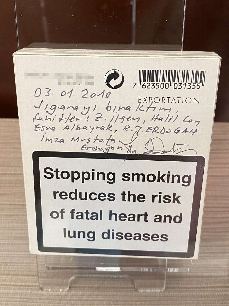 Sigarayı bırakma sözü veren vatandaşlardan toplanan sigara paketleri bir koleksiyona dönüştü. 215 adet sigara paketi Cumhurbaşkanlığı Külliyesi Beştepe Sergi Salonu'nda sergileniyor. Sergide aile üyelerinden bakana, milletvekilinden muhtarlara kadar toplumun farklı kesimlerinden alınan sigara paketleri bulunuyor. Sigara paketlerinin üzerinde o ana şahitlik edenler ve bazı notlar da yer alıyor.