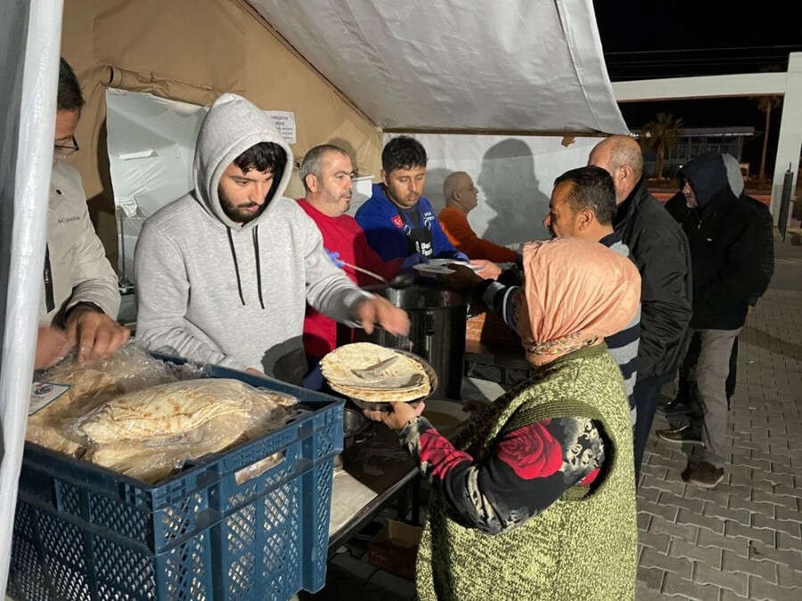 Aşevinde dağıtılan çorba, peynir, zeytin ve balı yiyen depremzedeler, ezan vaktinin gelmesiyle oruca niyetlenerek dua etti.