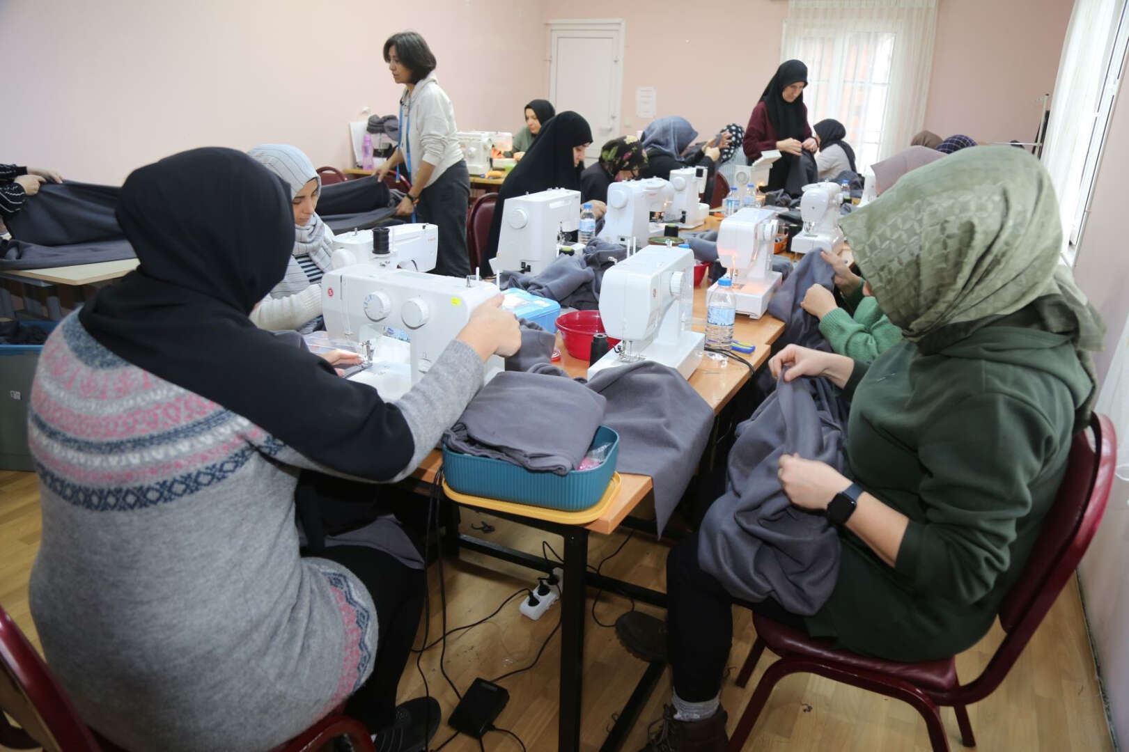 Yardımsever kadınlar, aldıkları kumaşlarla depremzedelerin ısınmasına katkı sunmak için kurs merkezinde ve evlerinde atkı, bere, eldiven, eşofman, polar ve battaniye üretmeye başladılar. GÖLMEK eğitmenleri öncülüğünde organize olan onlarca ev hanımı ve genç kursiyerler, sabah erken saatlerde kurs merkezlerine gelerek, gün boyunca depremzedeler için giysi dikmeye devam ediyor.