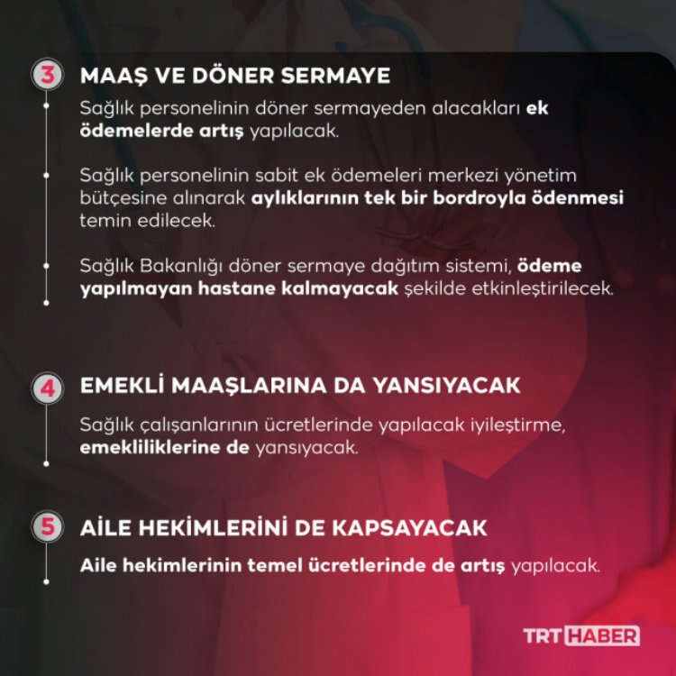 Üçüncü müjdemiz sağlık çalışanlarımızın ücret düzenlemesiyle ilgilidir. Sağlık çalışanlarımızın maaş ödeme sistemlerinde ve mali haklarında önemli iyileştirmeler sağlıyoruz.