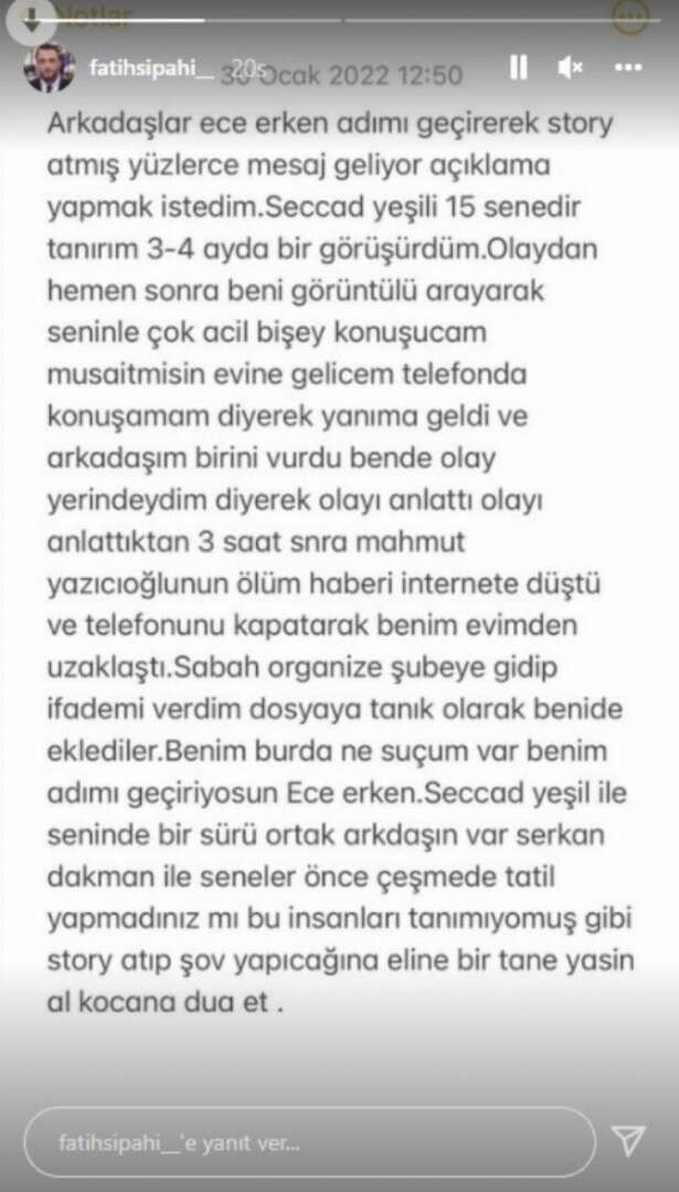 "Arkadaşlar Ece Erken adımı geçirerek bir story atmış o yüzden açıklama yapmak istedim. Seccad Yeşili 15 senedir tanırım 3-4 ayda bir görüşürüm. Olay gecesi beni görüntülü arayarak seninle acil bir şey konuşmam lazım diyerek evime geldi ve 'Arkadaşım birini vurdu' diyerek olayı anlattı. Kendisine olay yerindeymiş 3 saat sonra Şafak Mahmut Yazıcıoğlu'nun öldüğü haberleri yayılınca telefonunu kapatarak evimden gitti. Sabah organize şubeye giderek ifademi verdim tanık olarak eklediler. Benim burada ne suçum var adımı geçiriyorsun Ece Erken? Seccad Yeşil ile seninde bir sürü ortak arkadaşın var. Serkan Dakman ile seneler önce beraber Çeşme'de tatile yapmadınız mı? Bu insanları tanımıyormuş gibi story atıp şov yapacağına eline bir Yasin al da kocana dua et!"