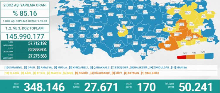 Türkiye'de son 24 saatte 348 bin 146 Kovid-19 testi yapıldı, 27 bin 671 kişinin testi pozitif çıktı, 170 kişi yaşamını yitirdi.