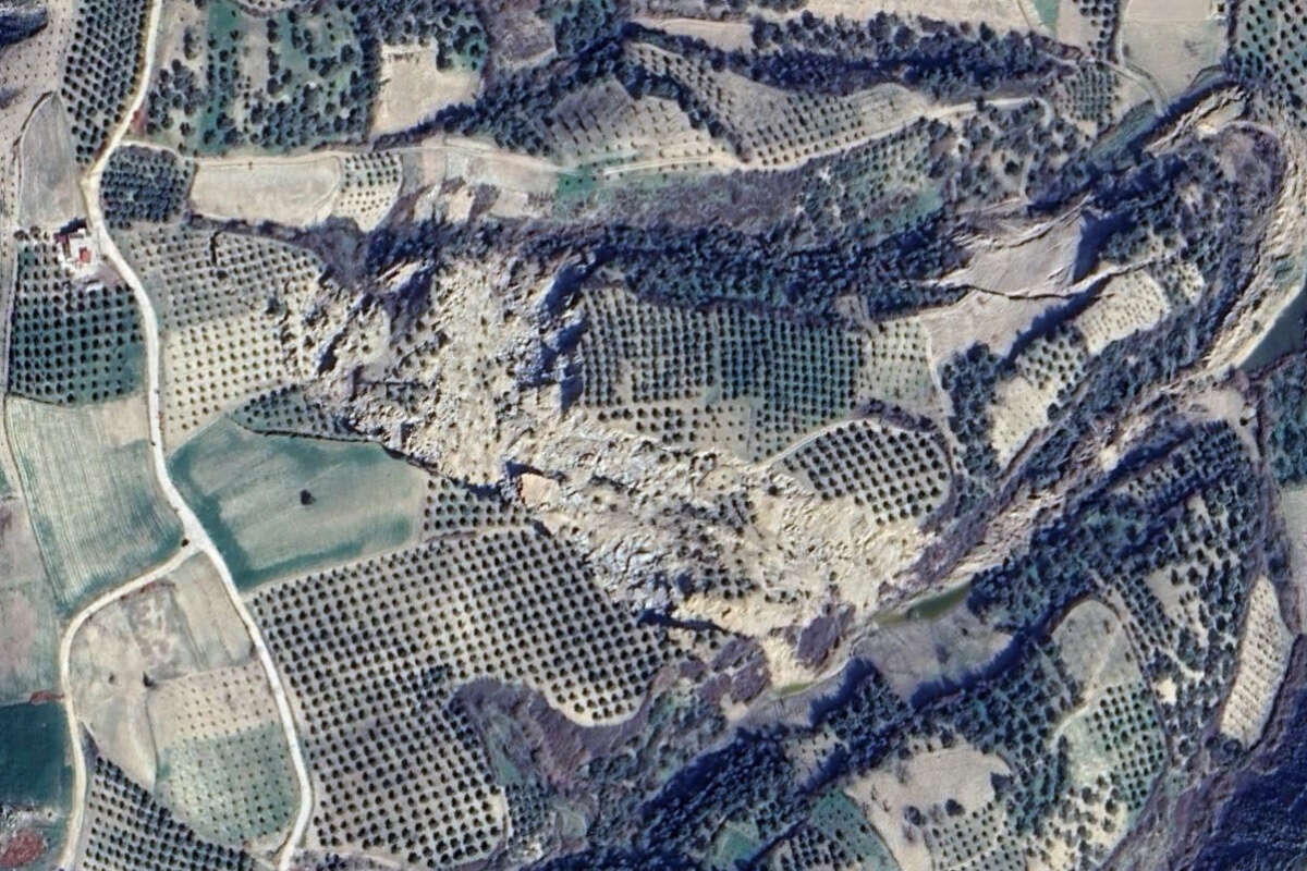 Hatay’da deprem sonrası Tepehan Köyündeki 35 dönümlük zeytin bahçesi 500 metre uzunluğunda oluşan dev yarık uzaydan gözüküyor.