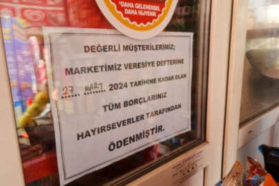 Karadeniz Ereğli' de bir hayırsever girdiği bir markette veresiye defterindeki tüm borçları ödedi. Veresiye defterindeki 10 bin liraya yakın borcu ödeyen hayırsever, markete borcu olan ailelerin yüzünü güldürdü. Potbaşı Mahallesinde market işleten Muammer Arslan, iş yerine "Bakkalımıza 27.03.2024 tarihine kadar veresiye borcu olanların borçları hayırseverler tarafından ödenmiştir" yazılı afişi astı.