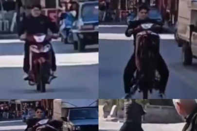 Ehliyetsiz motosiklet kullanan D.E.A.'nın ön kaldırarak tehlikeli anları da sosyal medyada paylaşıldı.