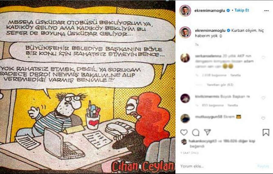 Ekrem İmamoğlu, otobüs bekleyenlerin İBB'ye yönelik isyanını anlatan bir karikatürü sosyal medya hesabından paylaştı. İmamoğlu, paylaşımına "Kurban oliyim, hiç haberim yok" notunu düştü.