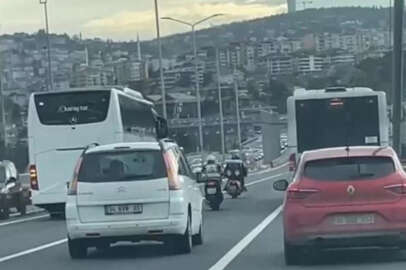 İstanbul'da, etkili olan rüzgar ve fırtına nedeniyle 15 Temmuz Şehitler Köprüsü'nden geçerken zor anlar yaşayan motosikletlilere, trafikteki araçlar kalkan oldu. O anlar, cep telefonu kamerasına yansıdı.
