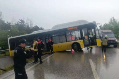 İstanbul Büyükçekmece'de bir İETT otobüsü, yağışın etkisiyle kayarak bariyerlere çarptı