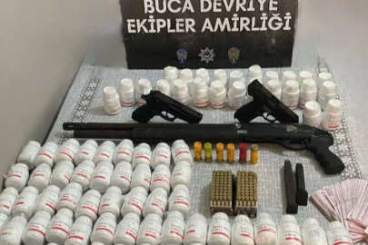 Buca İlçe Emniyet Müdürlüğü Devriye Ekipler Amirliğine bağlı birimler, T.K. adlı bir şüphelinin uyuşturucu madde ticareti yaptığı bilgisi üzerine harekete geçti. Şüpheliyi yakalayan ekipler tarafından adresinde yapılan aramada, yeşil reçeteye tabi 5 bin 589 sentetik hap, 1 ruhsatsız tabanca, 90 fişek, 1 yarı otomatik av tüfeği, 8 kartuş ve 1 kurusıkı tabanca ele geçirildi.